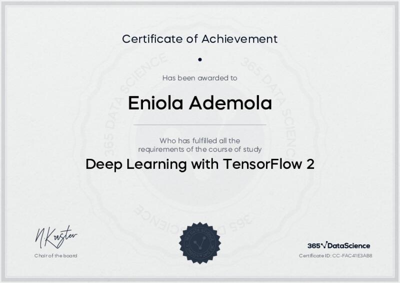 This user has been awarded the Deep Learning with TensorFlow 2 Certificate for successfully completing the course exam. Holding this certificate demonstrates their proficiency on the topic and signifies they are qualified to apply their newly acquired expertise in the fields of data analytics and data science.