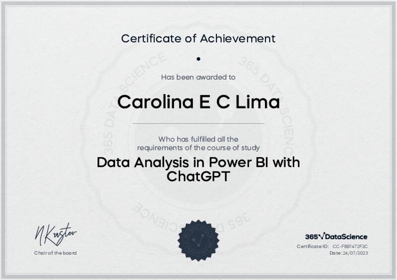 This user has been awarded the Data Analysis in PowerBI with ChatGPT Certificate for successfully completing the course exam. Holding this certificate demonstrates their proficiency on the topic and signifies they are qualified to apply their newly acquired expertise in the fields of data analytics and data science.