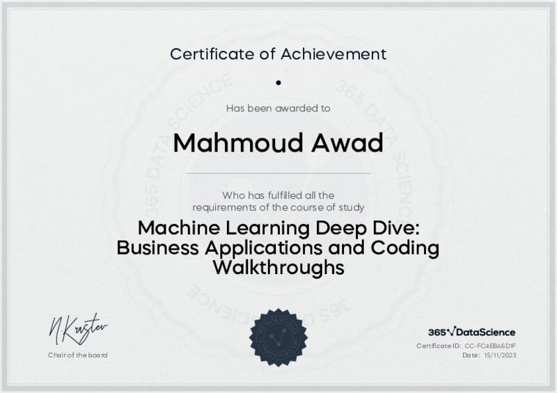 This user has been awarded the Machine Learning Deep Dive: Business Applications and Coding Walkthroughs Certificate for successfully completing the course exam. Holding this certificate demonstrates their proficiency on the topic and signifies they are qualified to apply their newly acquired expertise in the fields of data analytics and data science.