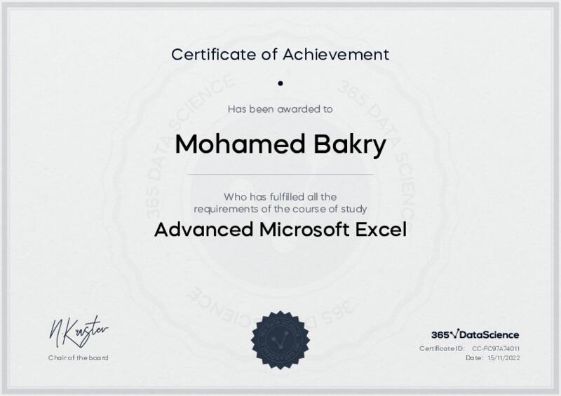 This user has been awarded the Advanced Microsoft Excel Certificate for successfully completing the course exam. Holding this certificate demonstrates their proficiency on the topic and signifies they are qualified to apply their newly acquired expertise in the fields of data analytics and data science.