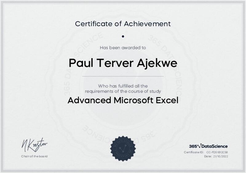 This user has been awarded the Advanced Microsoft Excel Certificate for successfully completing the course exam. Holding this certificate demonstrates their proficiency on the topic and signifies they are qualified to apply their newly acquired expertise in the fields of data analytics and data science.