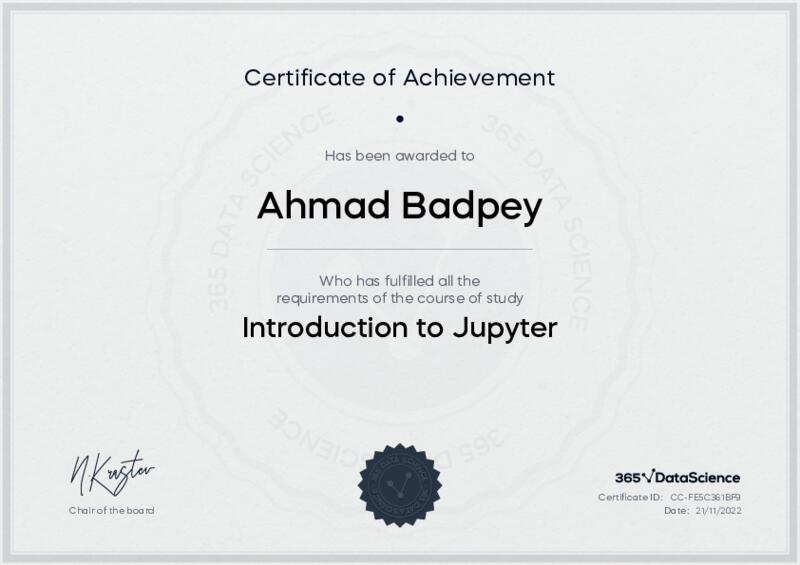 This user has been awarded the Introduction to Jupyter Certificate for successfully completing the course exam. Holding this certificate demonstrates their proficiency on the topic and signifies they are qualified to apply their newly acquired expertise in the fields of data analytics and data science.