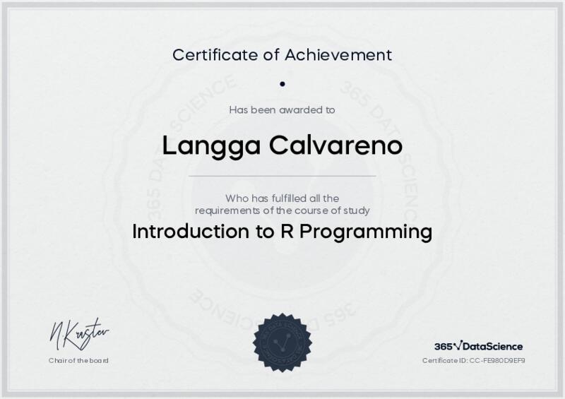 This user has been awarded the Introduction to R Programming Certificate for successfully completing the course exam. Holding this certificate demonstrates their proficiency on the topic and signifies they are qualified to apply their newly acquired expertise in the fields of data analytics and data science.