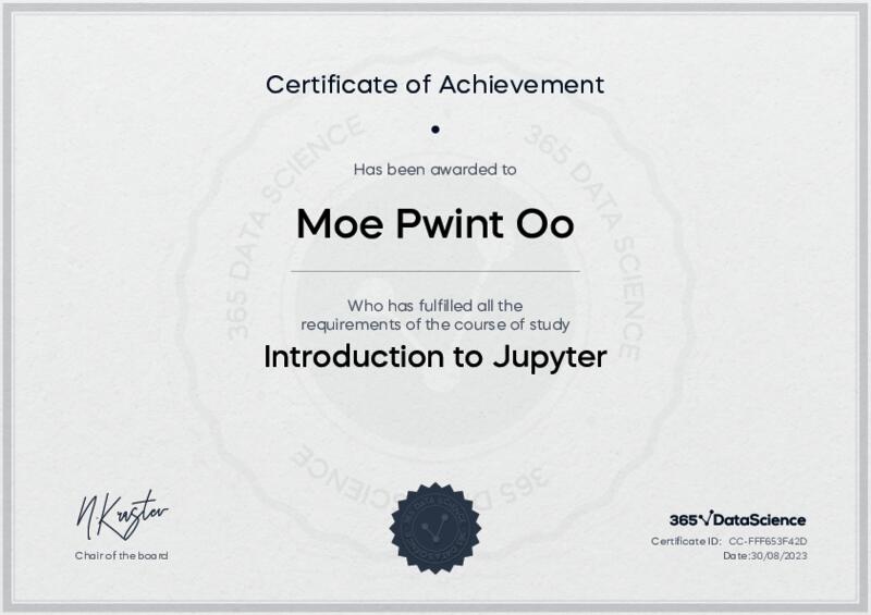This user has been awarded the Introduction to Jupyter Certificate for successfully completing the course exam. Holding this certificate demonstrates their proficiency on the topic and signifies they are qualified to apply their newly acquired expertise in the fields of data analytics and data science.