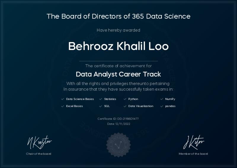 This user has been awarded the Data Analyst Career Track Certificate for successfully completing all courses and assessments. This certificate confirms their technical expertise and professional credibility to work as a data analyst.