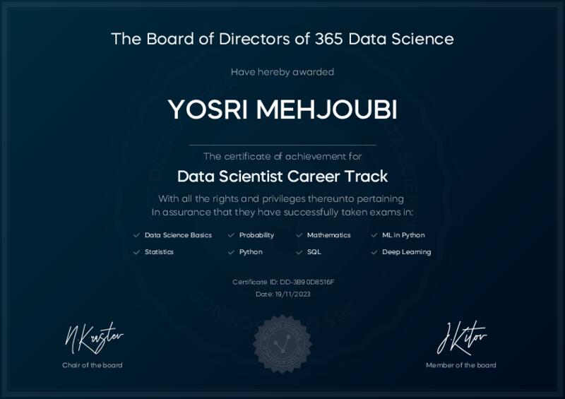 This user has been awarded the Data Scientist Career Track Certificate for successfully completing all courses and assessments. This certificate confirms their technical expertise and professional credibility to work as a data scientist.