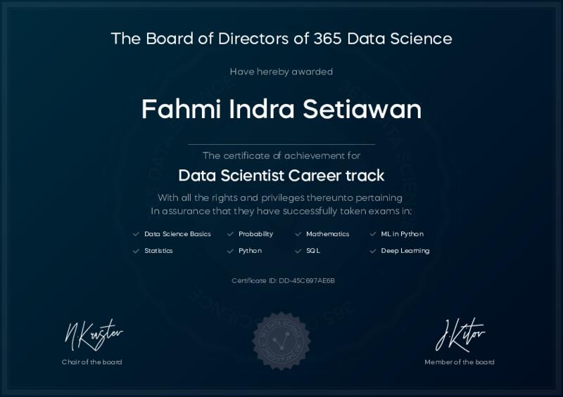 This user has been awarded the Data Scientist Career Track Certificate for successfully completing all courses and assessments. This certificate confirms their technical expertise and professional credibility to work as a data scientist.
