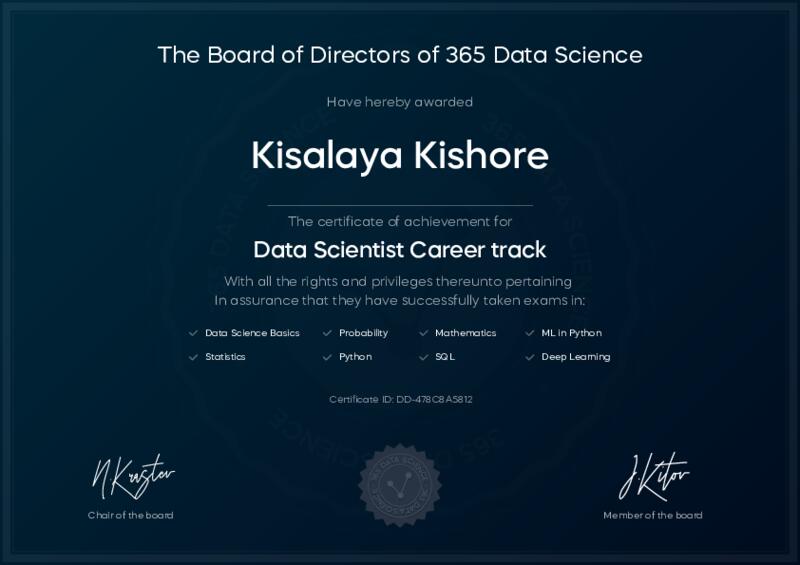 This user has been awarded the Data Scientist Career Track Certificate for successfully completing all courses and assessments. This certificate confirms their technical expertise and professional credibility to work as a data scientist.