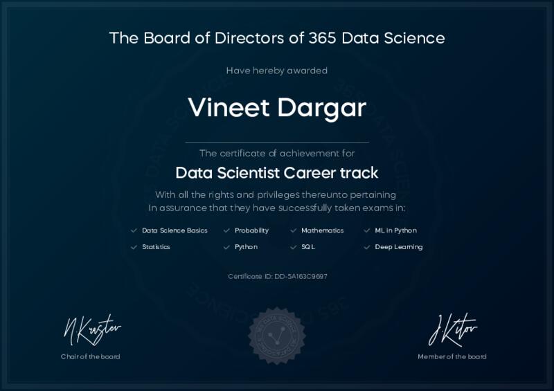 This user has been awarded the Data Scientist Career Track Certificate for successfully completing all courses and assessments. This certificate confirms their technical expertise and professional credibility to work as a data scientist.
