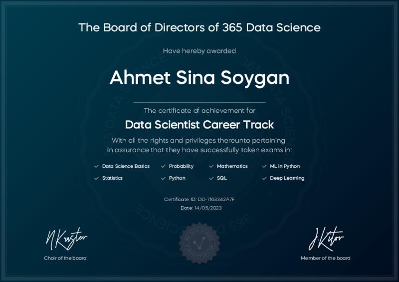 This user has been awarded the Data Scientist Career Track Certificate for successfully completing all courses and assessments. This certificate confirms their technical expertise and professional credibility to work as a data scientist.