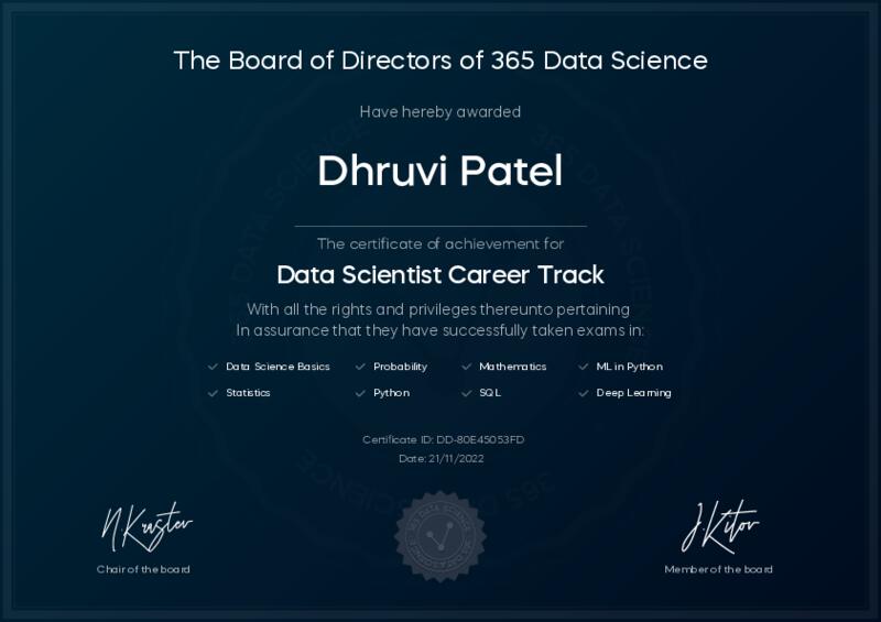 This user has been awarded the Data Scientist Career Track Certificate for successfully completing all courses and assessments. This certificate confirms their technical expertise and professional credibility to work as a data scientist.