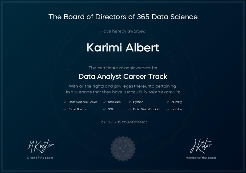 This user has been awarded the Data Analyst Career Track Certificate for successfully completing all courses and assessments. This certificate confirms their technical expertise and professional credibility to work as a data analyst.