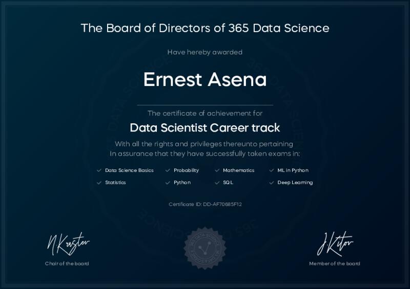 This user has been awarded the Data Scientist Career Track Certificate for successfully completing all courses and assessments. This certificate confirms their technical expertise and professional credibility to work as a data scientist.