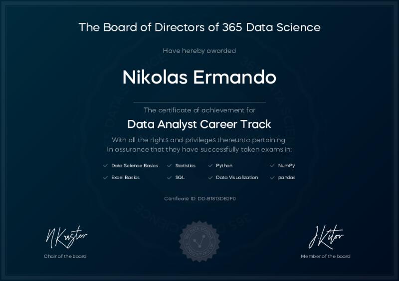 This user has been awarded the Data Analyst Career Track Certificate for successfully completing all courses and assessments. This certificate confirms their technical expertise and professional credibility to work as a data analyst.