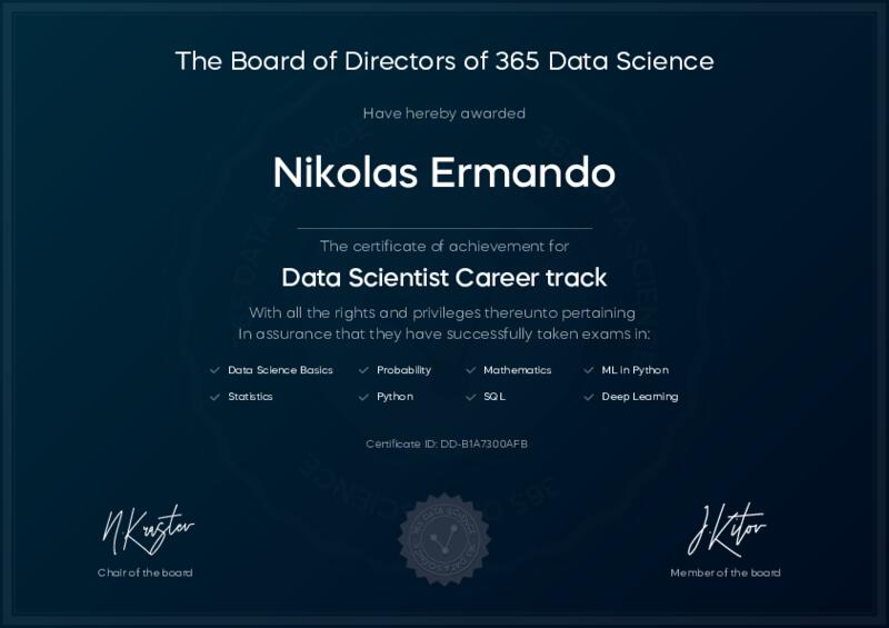 This user has been awarded the Data Scientist Career Track Certificate for successfully completing all courses and assessments. This certificate confirms their technical expertise and professional credibility to work as a data scientist.