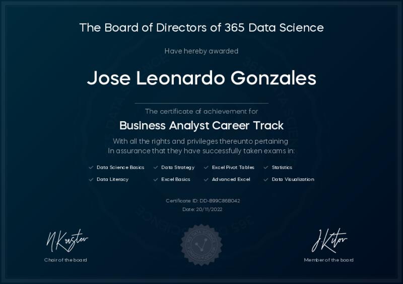 This user has been awarded the Business Analyst Career Track Certificate for successfully completing all courses and assessments. This certificate confirms their technical expertise and professional credibility to work as a business analyst.
