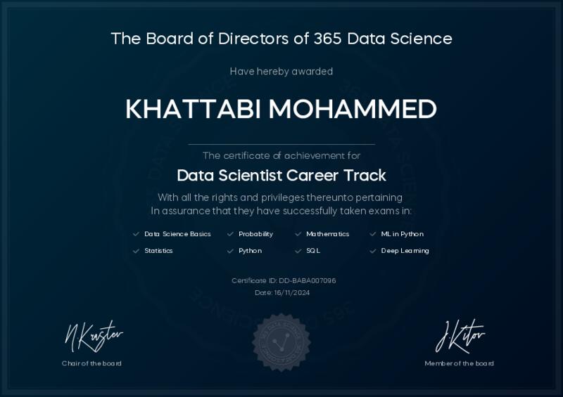 This user has been awarded the Data Scientist Career Track Certificate for successfully completing all courses and assessments. This certificate confirms their technical expertise and professional credibility to work as a data scientist.