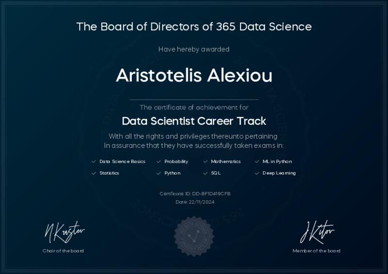This user has been awarded the Data Scientist Career Track Certificate for successfully completing all courses and assessments. This certificate confirms their technical expertise and professional credibility to work as a data scientist.