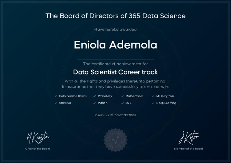This user has been awarded the Data Scientist Career Track Certificate for successfully completing all courses and assessments. This certificate confirms their technical expertise and professional credibility to work as a data scientist.
