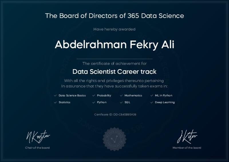 This user has been awarded the Data Scientist Career Track Certificate for successfully completing all courses and assessments. This certificate confirms their technical expertise and professional credibility to work as a data scientist.