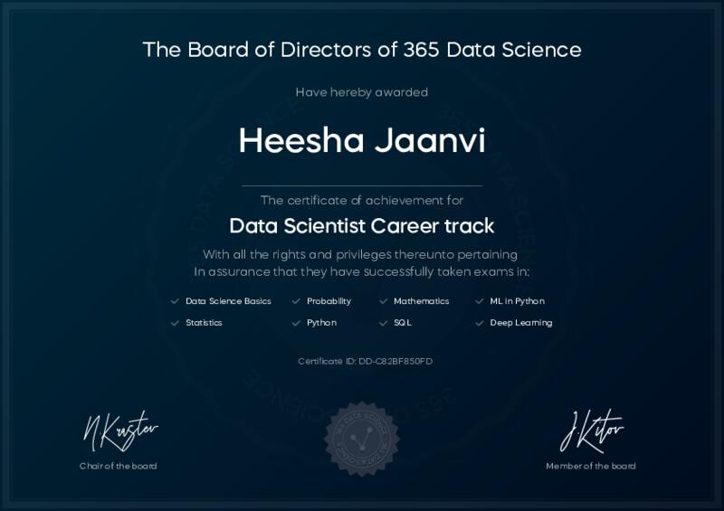 This user has been awarded the Data Scientist Career Track Certificate for successfully completing all courses and assessments. This certificate confirms their technical expertise and professional credibility to work as a data scientist.