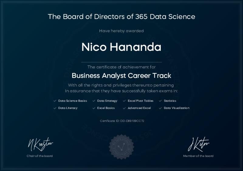 This user has been awarded the Business Analyst Career Track Certificate for successfully completing all courses and assessments. This certificate confirms their technical expertise and professional credibility to work as a business analyst.