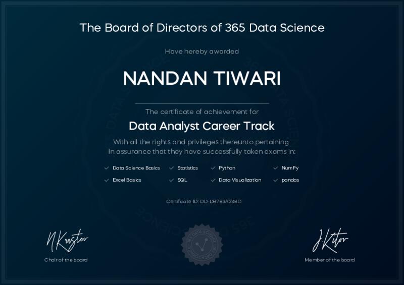 This user has been awarded the Data Analyst Career Track Certificate for successfully completing all courses and assessments. This certificate confirms their technical expertise and professional credibility to work as a data analyst.