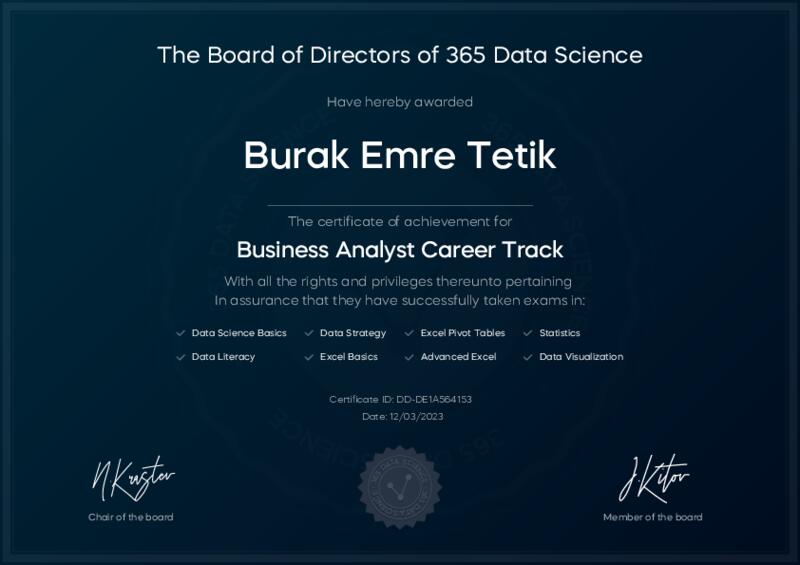 This user has been awarded the Business Analyst Career Track Certificate for successfully completing all courses and assessments. This certificate confirms their technical expertise and professional credibility to work as a business analyst.