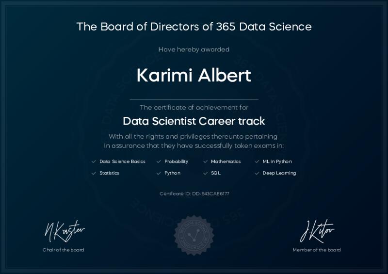 This user has been awarded the Data Scientist Career Track Certificate for successfully completing all courses and assessments. This certificate confirms their technical expertise and professional credibility to work as a data scientist.