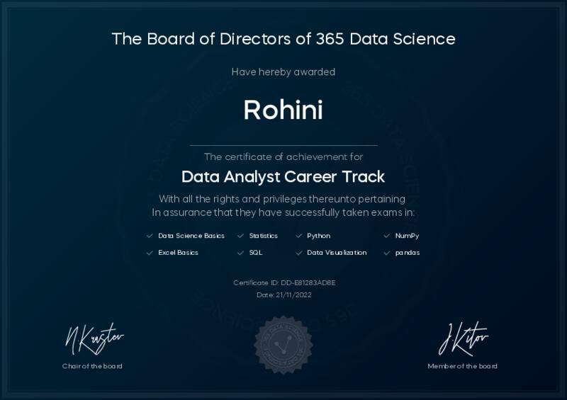 This user has been awarded the Data Analyst Career Track Certificate for successfully completing all courses and assessments. This certificate confirms their technical expertise and professional credibility to work as a data analyst.