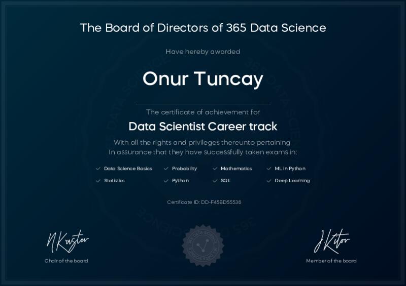 This user has been awarded the Data Scientist Career Track Certificate for successfully completing all courses and assessments. This certificate confirms their technical expertise and professional credibility to work as a data scientist.