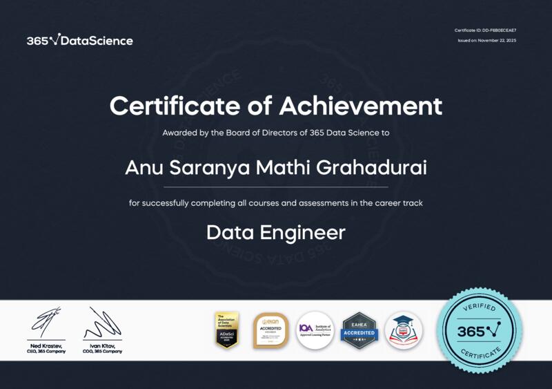 This user has been awarded the Data Engineer Career Track Certificate for successfully completing all courses and assessments. This certificate confirms their technical expertise and professional credibility to work as a data engineer.